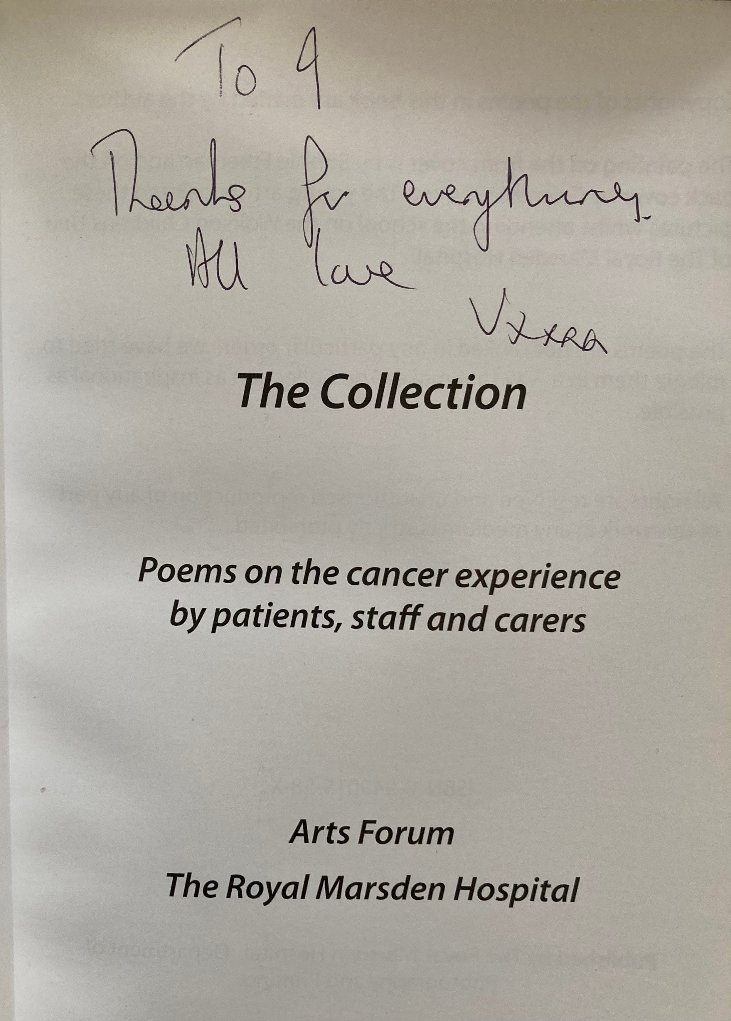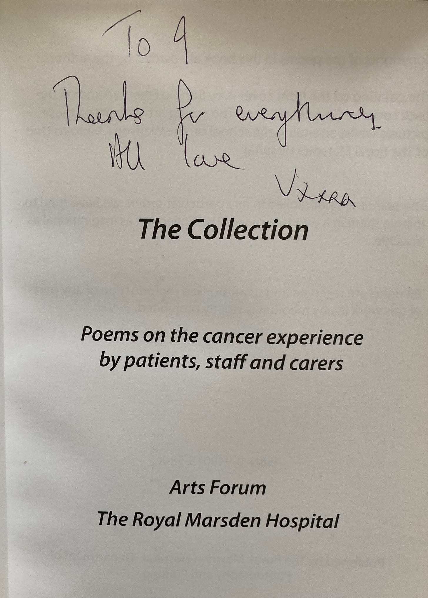 As I was making decisions, I read again a poem Vikki wrote and saw published in a beautiful collection by Royal Marsden patients, and which she read out at a moving evening event to an audience that included Andrew Motion, then the Poet Laureate, and me, bursting with pride. It captured the sentiment that I too felt when I was told a few weeks ago that I was going to need the chemo. Yer tiz, as we say in Dorset: